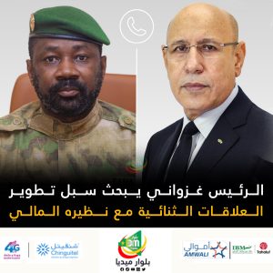 هاتف الرئيس المالي، آسيمي كويتا، ظهر اليوم الأربعاء، رئيس الجمهورية محمد ولد الشيخ الغزواني، الرئيس الدوري للاتحاد الأفريقي.وتناول الرئيسان بعد تبادل التهاني و التبريكات بمناسبة عيد الفطر المبارك؛ سبل تطوير العلاقات الثنائية بين البلدين الشقيقين، وبعض القضايا الإقليمية والإفريقية.