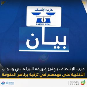 إن حزب الإنصاف بمناسبة نيل الحكومة ثقة البرلمان، وفي هذه المرحلة الحاسمة من تاريخ بلادنا التي تشهد تطورات كبيرة، أساسها الحرب على الفساد، وحماية مقدرات الشعب، والعناية المنقطعة النظير بشريحة الشباب، وترسيخ الديمقراطية من خلال تبني فلسفة التشاور والحوار الذين انتهجهما فخامة رئيس الجمهورية منذ مأموريته الأولى، يعلن: