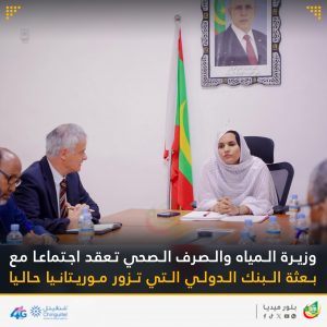اجتمعت وزيرة المياه والصرف الصحي، آمال بنت مولود، اليوم الثلاثاء، مع بعثة من البنك الدولي التي تزور موريتانيا حاليا، برئاسة شكيب جنان، المدير الإقليمي للتنمية المستدامة لمنطقة غرب ووسط إفريقيا.