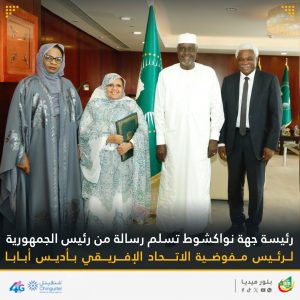 سلمت رئيسة جهة نواكشوط، فطمة عبد المالك، رئيسة المدن والحكومات المحلية المتحدة بإفريقيا، فطمة عبد المالك، اليوم الخميس رسالة من رئيس الجمهورية محمد ولد الشيخ الغزواني الرئيس الدوري للاتحاد الإفريقي إلى موسى فقي محمد رئيس مفوضية الاتحاد الإفريقي.