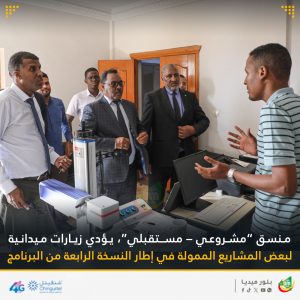 أدى منسق برنامج “مشروعي – مستقبلي”، عبد الله عبد الجليل زيارات ميدانية لبعض المشاريع الممولة في إطار النسخة الرابعة من البرنامج.ووفق الصفحة الرسمية لوزارة تمكين الشباب والرياضة والخدمة المدنية فإن هذه الزيارات تهدف إلى التأكد من أن المشاريع الممولة تم إنشاؤها على أرض الواقع، من حيث وجود المحلات؛ وعمل المشروع؛ فضلا عن قدرته على الاستمرارية من أجل خلق فرص عمل لعدد كبير من الشباب العاطلين عن العمل.