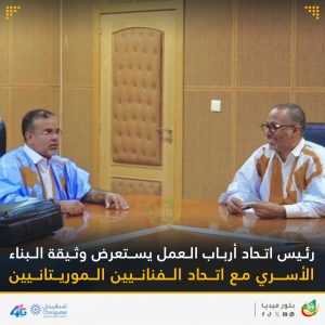 اجتمع رئيس الاتحاد الوطني لأرباب العمل الموريتانيين، محمد زين العابدين وبد الشيخ أحمد اليوم بمكتبه، مع اتحاد الفنانين الموريتانيين برئاسة رئيسها محفوظ ولد بوب جدو.وتناول اللقاء شرح وثيقة ميثاق البناء الأسري الذي أطلقه مؤخراً اتحاد أرباب العمل، والذي يهدف إلى محاربة ظاهرة الإسراف والبذخ في المناسبات الاجتماعية.
