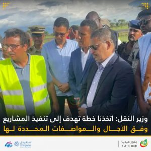 قال وزير التجهيز والنقل الموريتاني اعل ولد الفيرك إن الحكومة اتخذت خطة تهدف إلى تنفيذ المشاريع وفق الآجال والمواصفات المحددة لها.