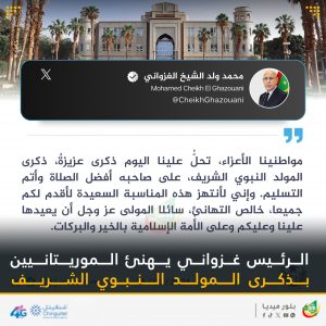 تقدم رئيس الجمهورية محمد ولد الشيخ الغزواني، في تغريدة على موقع إكس – تويتر سابقا – بالتهاني للشعب الموريتاني بمنسابة ذكرى المولد النبوي الشريف.وجاء نص التغريدة: